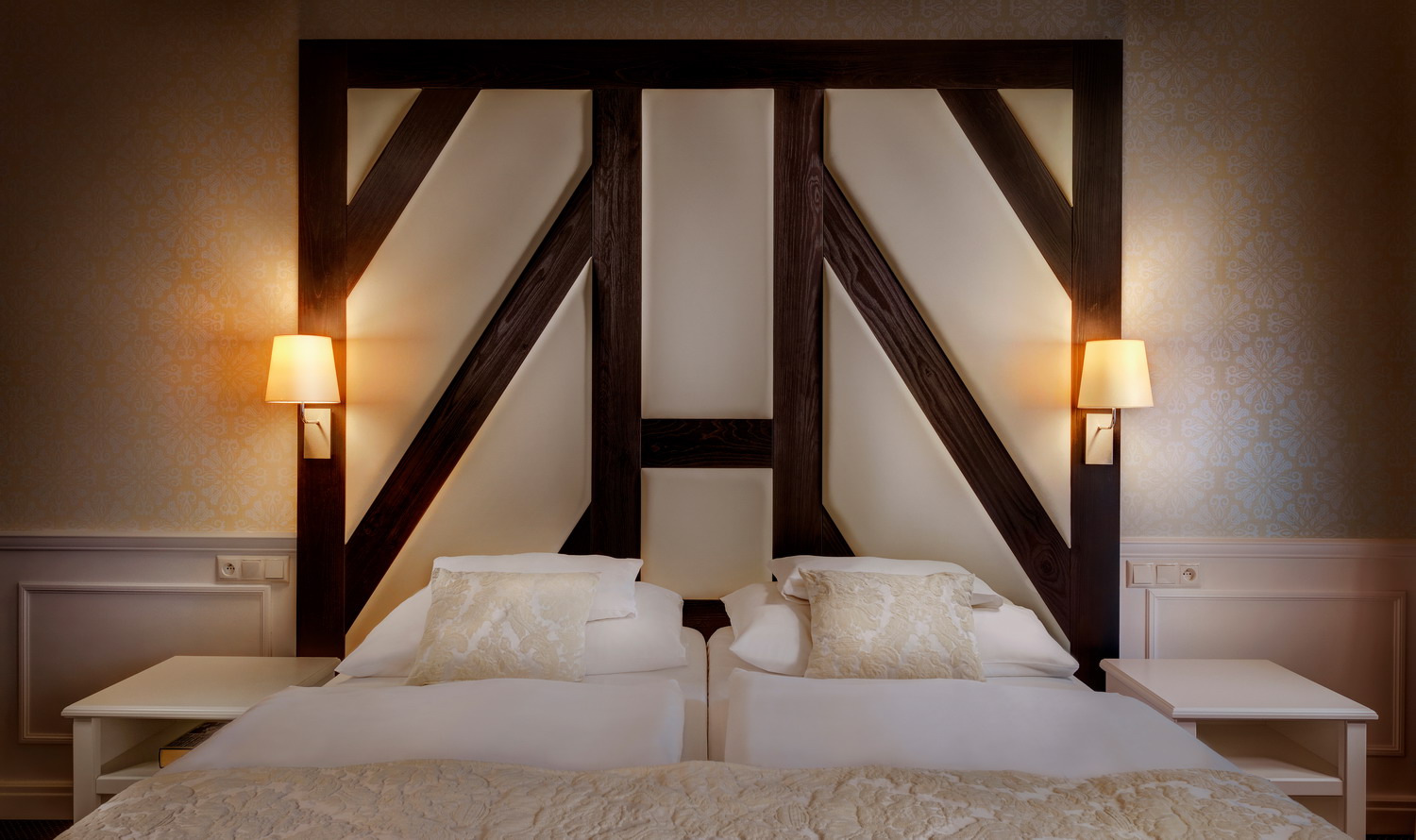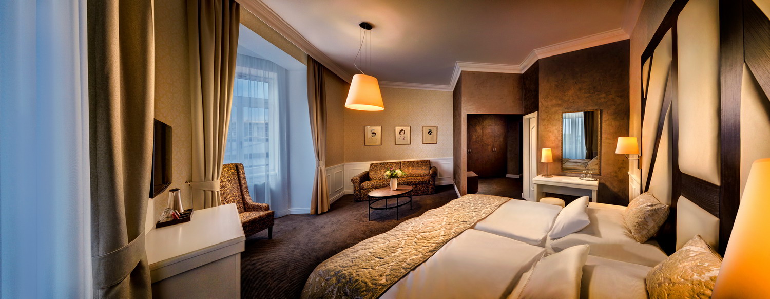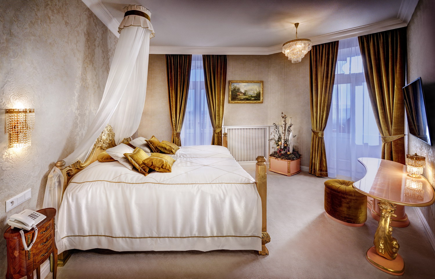 Priestranné apartmány so spálňou a obývacou miestnosťou, možnosť prístelky. Pôvodné krištáľové lustre a historické detaily vytvárajú jedinečnú atmosféru.