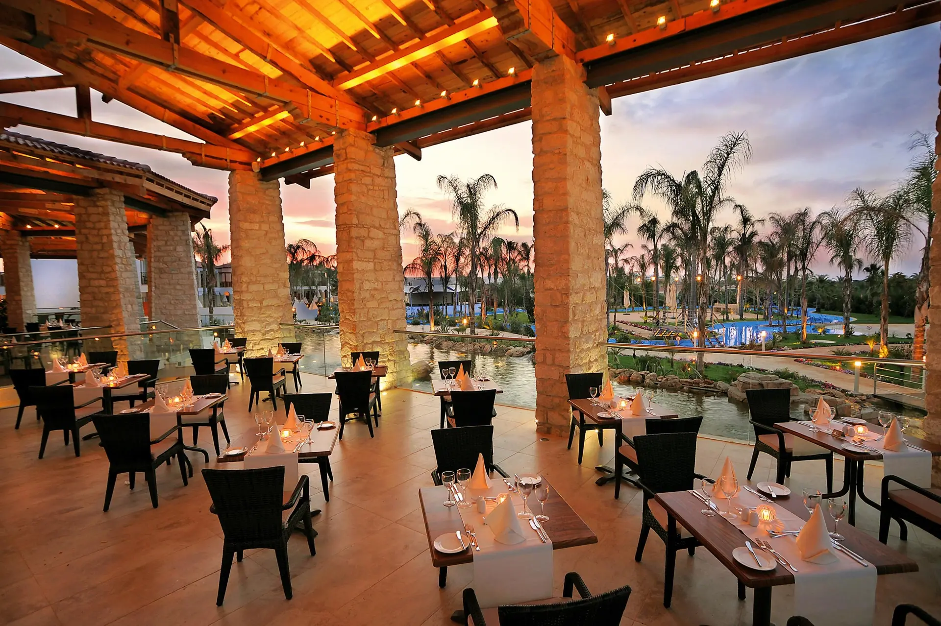Rezort ponúka all-inclusive s hlavnou reštauráciou a tematickými reštauráciami, ktoré servírujú taliansku, ázijskú aj tradičnú cyperskú kuchyňu. Hostia majú k dispozícii viacero barov, vrátane pool barov a lounge barov, kde si počas celého dňa môžu vychutnávať osviežujúce nápoje a drobné občerstvenie.
