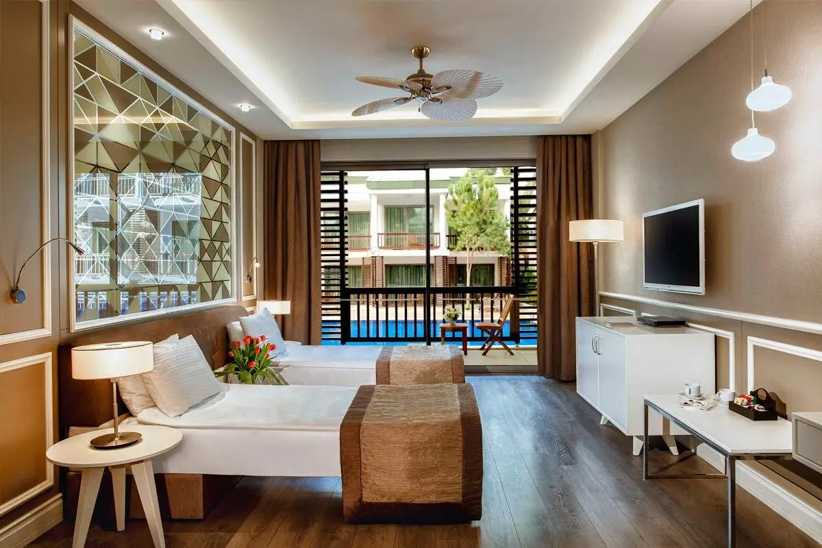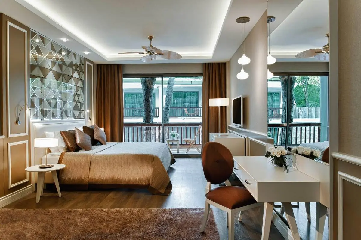 Hotel pozostáva z troch hlavných budov s komfortnými izbami s výhľadom na more alebo borovicový les a z útulných bungalovov, ktoré poskytujú viac súkromia. Súkromná pláž a rozsiahly aquapark s piatimi bazénmi robia z hotela ideálne miesto nielen pre golfistov, ale aj pre páry a rodiny, ktoré chcú spojiť golfový pobyt s oddychom a zábavou. Izby sú vybavené kompletnou kúpeľňou so sprchou alebo vaňou, WC, sušičom vlasov, klimatizáciou, telefónom, satelitnou TV, minibarom, trezorom a balkónom alebo terasou.